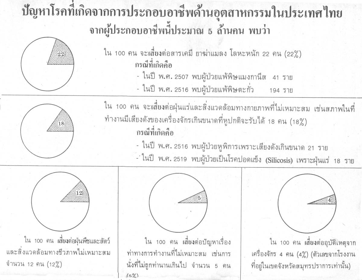 นพ.ชินโอสถ : เรายังไม่ได้สำรวจทั้งหมด พูดจริง ๆ ก็ยังไม่สามารถได้ข้อมูลที่แน่ชัด แต่เราใช้วิธีไปดูจากทะเบียนของกระทรวงอุตสาหกรรม ว่าเจ้าของโรงงานแต่ละแห่ง เขาไปขึ้นทะเบียน จดทะเบียน ว่าเขาผลิตอะไรบ้าง และเขามีสารอะไร หรือสิ่งอะไรที่ใช้ในการผลิต ก็พบว่า ในจำนวนคนงานประมาณ 5 ล้านคน จากทะเบียนของกระทรวงอุตสาหกรรมที่ทำไว้ ตั้งแต่ปี 2515 นั้น 22 เปอร์เซ็นต์ เสี่ยงต่อสารเคมี ยาฆ่าแมลง โลหะหนัก 18 เปอร์เซ็นต์ เสี่ยงต่อฝุ่น แร่ สิ่งแวดล้อมทางกายภาพที่ไม่เหมาะสม เช่น เสียงดังเกินขนาด แสงสว่างไม่เพียงพอ 12 เปอร์เซ็นต์เสี่ยงต่อฝุ่น พืช สัตว์ สิ่งแวดล้อมทางชีวภาพที่ไม่เหมาะสม 5 เปอร์เซ็นต์ เสี่ยงต่อปัญหาเรื่องท่าทางในการทำงานที่ไม่เหมาะสม เช่นนั่งไม่ถูกท่า และ 4 เปอร์เซ็นต์ เสี่ยงจากอุบัติเหตุ ซึ่งเฉพาะอันนี้เป็นตัวเลขที่วิเคราะห์จากผู้ป่วยที่อยู่ในเขตสมุทรปราการ ซึ่งเป็นย่านโรงงานอุตสาหกรรม เท่านั้น (ดูแผนภูมิ)