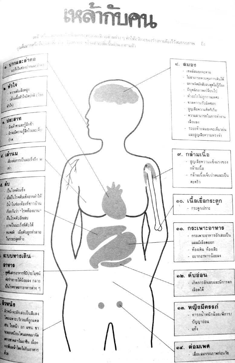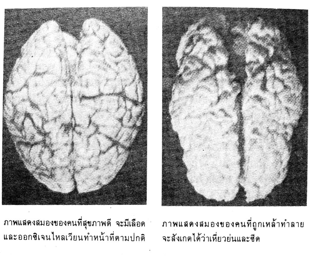 “ส่วนมากทุกคนก็รู้จักพิษของเหล้า โทษของเหล้า คือ อย่างแรก ทำให้เสียเงิน อย่างที่สอง คือ ถ้าดื่มจนติดงอมแงมก็จะทำให้ครอบครัวแตกสลาย นอกจากนั้น ยังทำให้ระบบประสาทและสมองเสียไป คนที่ดื่มเหล้าติดต่อกันเป็นระยะเวลานาน เมื่อผ่าสมองดูจะพบว่า สมองของผู้นั้นจะเหี่ยว หรือฝ่อมากกว่าคนที่ไม่ดื่มเหล้า และมีโอกาสเป็นโรคของสมองเสื่อมมากกว่า นอกจากนี้สมองเล็กที่อยู่ข้างหลังที่เรียกว่าซีลีเบลรัม ซึ่งทำหน้าที่เกี่ยวกับการทรงตัว หรือควบคุมการเดินจะเสียไป แม้ว่าจะเลิกดื่มเหล้าแล้วเป็นเดือน ก็ยังมีอาการเซ ทรงตัวไม่อยู่ ชาวบ้านเรียกว่า “เมาดิบ” ในเมืองไทยยังพบน้อยราย ไม่มากเท่าต่างประเทศ