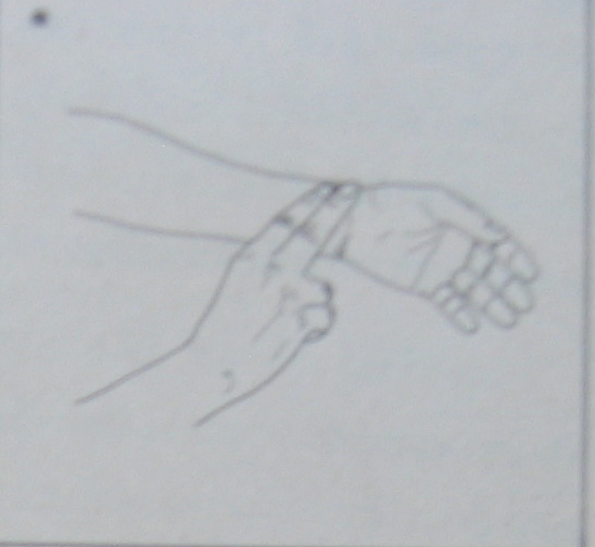 1. ที่ข้อมือทั้งสองข้าง โดยใช้นิ้วชี้ นิ้วกลางและนิ้วนางของมือข้างที่ถนัดจับลงบนข้อมือทางด้านหัวแม่มือ