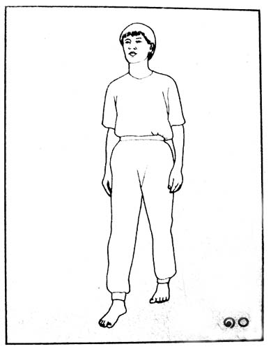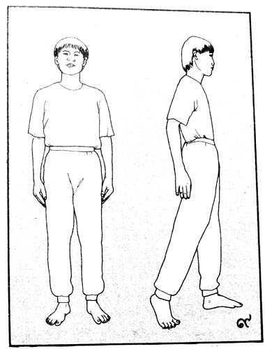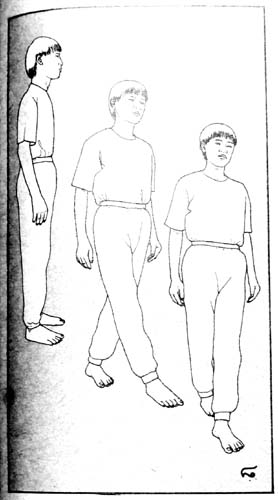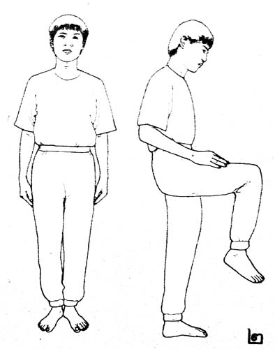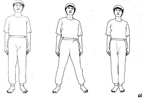 ท่าที่ 1 เริ่มต้นในท่ายืนกางขาเล็กน้อย ลงน้ำหนักที่ขาทั้งสองข้างเท่าๆ กัน จากนั้นเริ่มถ่ายน้ำหนักลงบนขาขวา และเปลี่ยนมาลงน้ำหนักบนขาซ้าย ทำสลับกันขวาและซ้าย