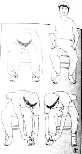 ท่าที่ 5 นั่งบนเก้าอี้ เท้าวางราบกับพื้น ก้มศีรษะและลำตัวลง เอามือไปจับข้อเท้าทั้ง 2 ข้าง จากนั้นยืดตัวขึ้นตรงในท่านั่ง เมื่อท่านทำได้ดีแล้ว เพิ่มความยากโดยก้มศีรษะและลำตัวลงพร้อมกับหมุนตัวไปข้างขวา โดยเอามือทั้ง 2 ข้างไปจับข้อเท้าขวา ยืดตัวขึ้นและหมุนตัวไปทางซ้าย โดยเอามือทั้ง 2 ข้างจับข้อเท้าซ้าย