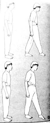 ท่าที่ 7 เดินบนพื้นราบโดยก้าวเท้าขวาออกไปทางด้านข้าง และก้าวเท้าซ้ายตามจนครบ 10 ก้าว เปลี่ยนมาก้าวเท้าซ้ายออกไปทางด้านข้างและก้าวเท้าขวาตามเช่นเดียวกัน เมื่อท่านทำได้ดีแล้วให้ฝึกการเดินแบบนี้บนทางลาด