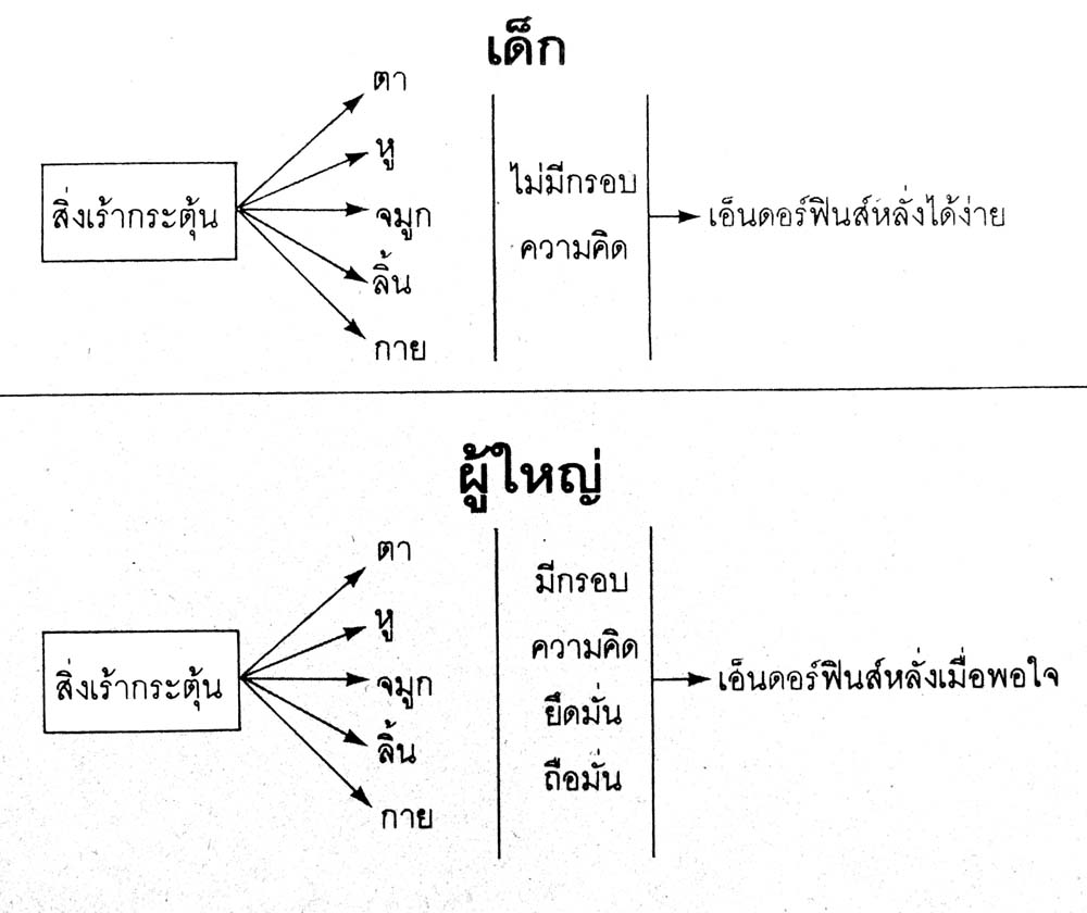 ในฐานะที่เป็นข่าวสารทางเคมีเกี่ยวกับอารมณ์ความรู้สึกนี้เอง เอ็นดอร์ฟินส์จึงเป็นสารเคมีที่อยู่เบื้องหลังการตัดสินใจเพื่อประเมินคุณค่าของบุคคล วัตถุ ความคิด และเหตุการณ์ที่แวดล้อมเราอยู่ ในแง่นี้แหละที่อาจทำให้เราสร้างสภาพแวดล้อมตามความอยากที่จะรับรู้ และนี่คือ การวางเงื่อนไขในแบบผู้ใหญ่ดังได้กล่าวไว้ อันเป็นการบดบังความสามารถที่จะได้รับรู้ความอุดมของธรรมชาติรอบตัว (ในแง่ของพุทธศาสนา เราอาจเปรียบได้กับการยึดมั่นถือมั่นในสิ่งต่างๆ นั่นเอง...ผู้แปล) ภายใต้สภาพแห่งการยึดติดนี้ เราก็เปรียบประดุจรูปปั้นหินอันแข็งทื่อ อยู่ท่ามกลางกระแสแห่งการเปลี่ยนแปลงอันไม่สิ้นสุด และสักวันหนึ่ง เราในฐานะรูปปั้นที่แข็งทื่อก็จะถูกคลื่นของการเปลี่ยนซัดกระหน่ำให้ล้มครืนลง