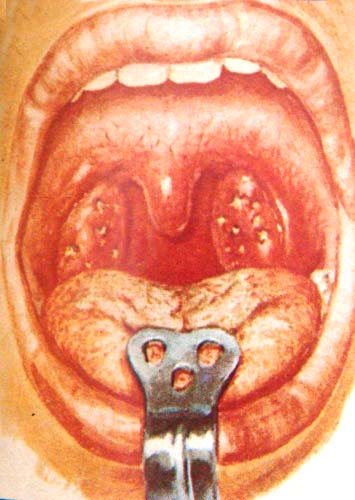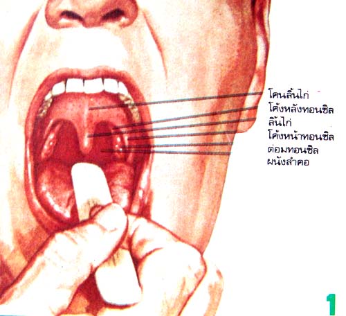 2. ถ้ายังเห็นไม่ถนัด ให้ใช้ที่กดลิ้น กดลงตรงกลางลิ้นพอแรง ห้ามกดที่โคนลิ้น เพราะจะทำให้คนไข้มีอาการคลื่นไส้ อาเจียนได้ แล้วใช้ไฟฉายส่องตรงไปต่อมทอนซิล และผนังลำคอ (รูปที่ 1)