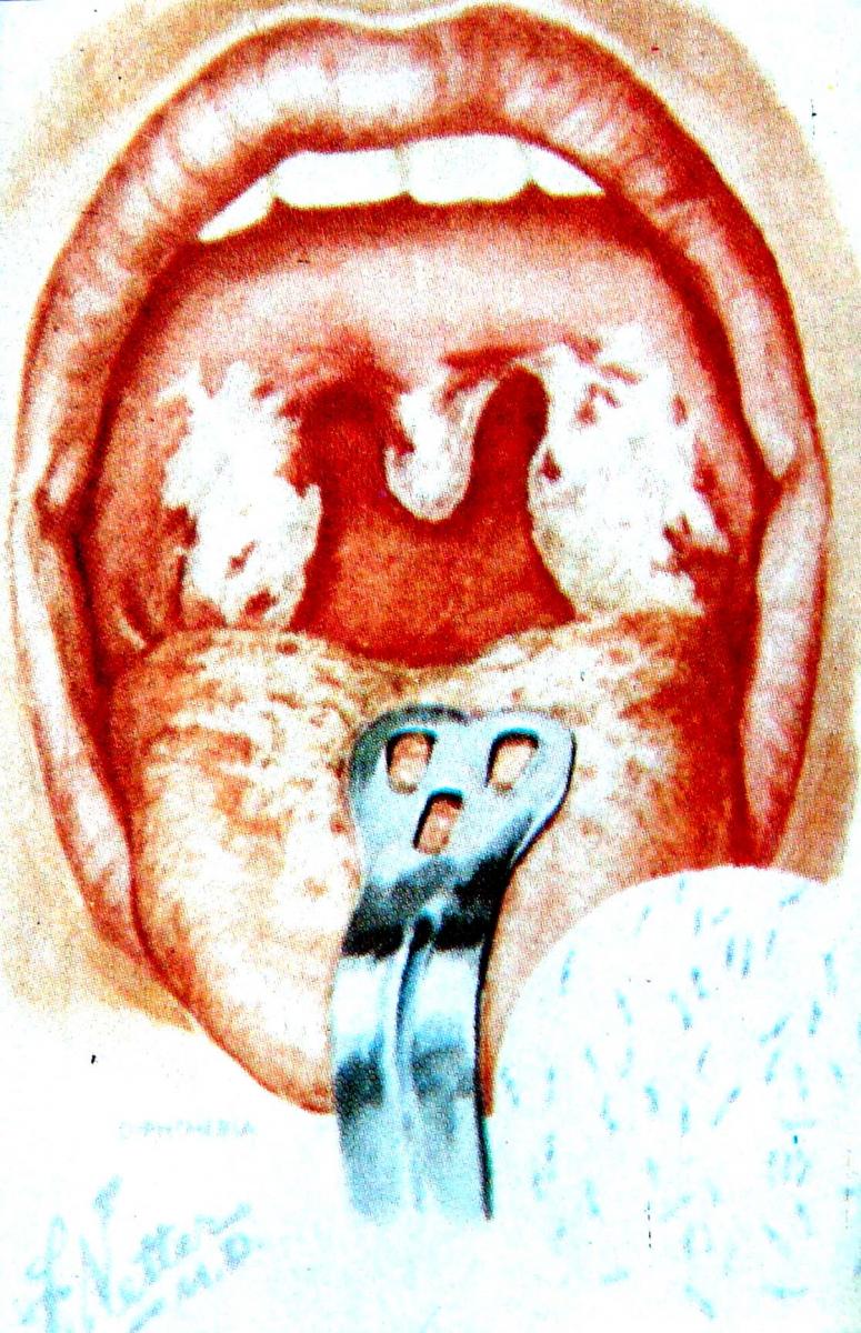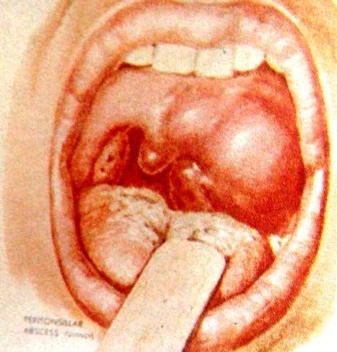 4. คนไข้ที่เป็นฝีของต่อมทอนซิล จะพบว่าต่อมทอนซิลข้างที่เป็นหนองจะโตจนดันลิ้นไก่เบี้ยวไปอีกข้างหนึ่ง คนไข้จะอ้าปากและพูดไม่ถนัด (รูปที่ 3)
