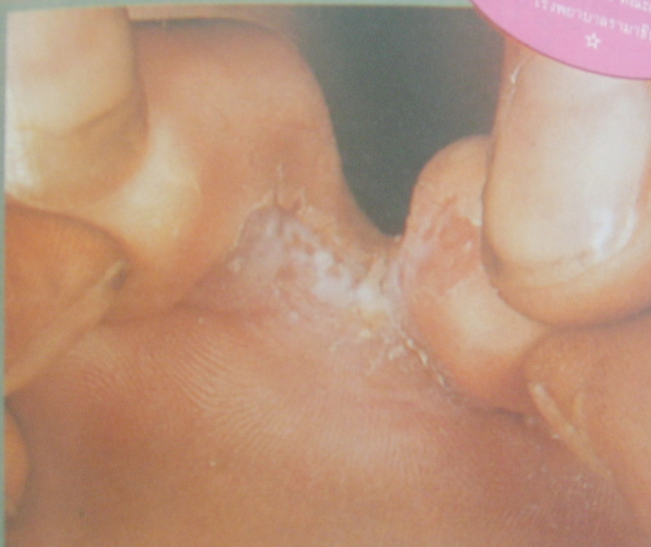 เมื่อมีอาการคันตามง่ามเท้า มักทำให้คิดว่าเกิดจากโรคเชื้อรา (กลาก) ดังที่เรียกกันว่า ฮ่องกงฟุตซึ่งจะมีอาการหนังเปื่อยลอกเป็นขุยๆ ( ดังรูป ) และจะรู้สึกคันมาก บางครั้งอาจลุกลามออกไปได้