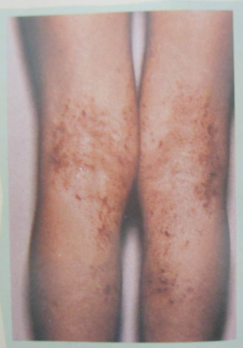 เด็กบางคนมักมีผื่นคันตามผิวหนังบ่อยๆขึ้นตรงบริเวณแก้ม ซอกคอ ข้อพับ หรือขาพับเป็นผื่นเล็กๆวากๆ มีลักษณะเฉพาะคือ ขึ้นพร้อมกันทั้ง 2 ข้าง เช่น ในรูปข้างบนนี้มีผื่นขึ้นที่ขาพับทั้ง 2 ข้าง