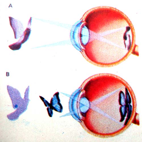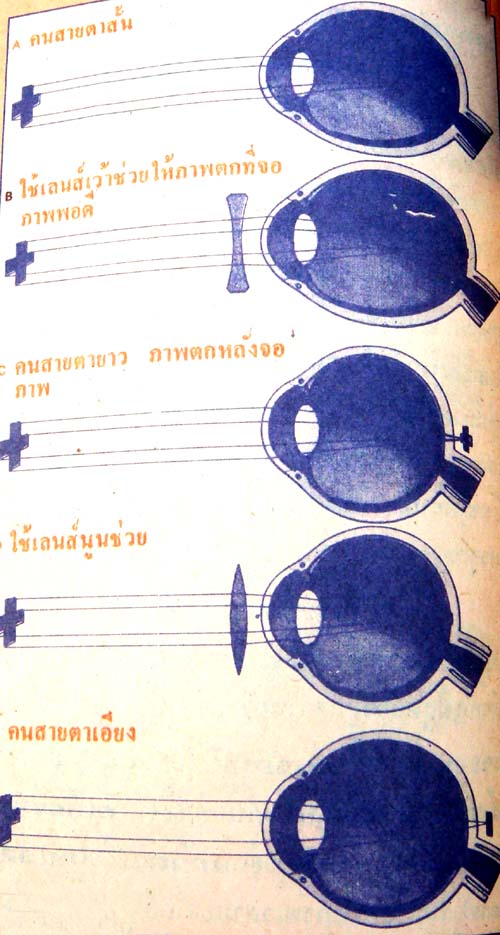 สายตาคนปกติขึ้นกับการหักเหของแสง กำลังของลูกตาและขนาดลูกตา ในคนสายตาสั้น กำลังการหักเหในแก้วตามีมากและและระยะที่กระบอกตายาว จึงทำให้ภาพเกิดหน้าจอภาพ จึงต้องใส่เลนส์เว้า (ดูรูปประกอบที่ 6) ในคนสายตายาว เนื่องจากกำลังการหักเหของแสงในแก้วตาอ่อนลง และ/หรือมีกระบอกตาสั้น ทำให้ภาพเกิดขึ้นหลังจอภาพ จึงต้องใส่เลนส์นูน ช่วยรวมแสงให้ตกที่จอภาพพอดี ในพวกสายตาเอียง (Astigmatism) การหักเหของแสงไม่เท่ากันในทุกทิศทุกทาง เนื่องจากรูปร่างของกระบอกตาที่ผิดปกติไป ทำให้การมองเห็นภาพผิดปกติไป จึงต้องแก้ด้วยเลนส์สายตาเอียง
