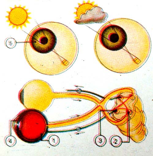 รูปที่ 3 “ในที่สว่าง (A) แสงจะกระตุ้นเซลล์สีที่จอภาพ (1) ซึ่งจะส่งสัญญาณไปที่ส่วนก้านสมอง (Brain Stem) (2) และศูนย์กลางสมอง (3) สั่งให้กล้ามเนื้อตรงรูม่านตาหดตัว และทำให้รูม่านตาหดเล็กลง ส่วนในที่มืด (B) กล้ามเนื้อจะหดตัวน้อยกว่า ทำให้แสงเข้าสู่ม่านตาได้มากขึ้น”