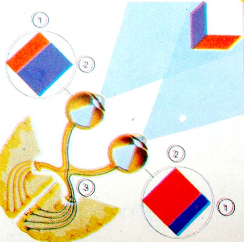 ที่จอภาพหรือเรตินา จะมีเซลล์ 4 ที่ไวต่อแสงและเป็นตัวรับรู้เกี่ยวกับเรื่องสี ซึงมี 2 ชนิด คือ หร็อด (Rod) กับโคน (Cone) เซลล์หร็อดรับรู้เกี่ยวกับความมืดและความสว่าง ส่วนเซลล์โคนจะเป็นตัวรับรู้เรื่องสี เซลล์โคนจะอยู่กันแน่นแถวตรงกลางจอภาพและอยู่แน่นหนาที่สุดที่จุดชื่อว่า โฟเวีย (Fovea) ซึ่งเป็นจุดที่รับภาพได้ชัดเจนที่สุด ส่วนเซลล์หร็อดจะกระจายอยู่ทั่วๆ ไป