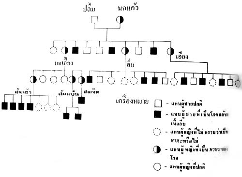 อ่านถึงตอนนี้ ท่านผู้อ่านคงพอจะเข้าใจได้ชัดเจนแล้วนะครับ ว่าโรค “กล้ามเนื้อแขนขาลีบ” ตามในข่าวหนังสือพิมพ์นี้เป็นกรรมพันธุ์แน่ๆ และเป็นโรคกรรมพันธุ์ที่เป็นเฉพาะในผู้ชาย โดยที่พันธุ์ผิดปกตินี้สืบทอดมาทางแม่ คือ แม่ไม่เป็นโรคแต่เป็นพาหะ ถ่ายทอดพันธุ์ผิดปกติไปให้ลูกชายเป็นโรคนี้ได้ แต่ไม่ได้หมายความว่าลูกชายทุกคนของแม่ที่เป็นพาหะจะต้องเป็นโรคนี้นะครับ ตามข่าวนี้นางนกแก้ว มีลูกชาย 6 คน เป็นโรคนี้เสีย 3 คน ส่วนนางอิ่มและนางเอียงมีลูกชายคนละ 5 และเป็นโรคนี้เสีย 3 คน จาก 5 คนเหมือนกัน ก็เห็นชัดนะครับว่าหญิงที่เป็นพาหะ ถ้ามีลูกชาย ลูกชายจะมีโอกาสเป็นโรคกล้ามเนื้อแขนขาลีบครึ่งหนึ่งหรือ 50 เปอร์เซ็นต์