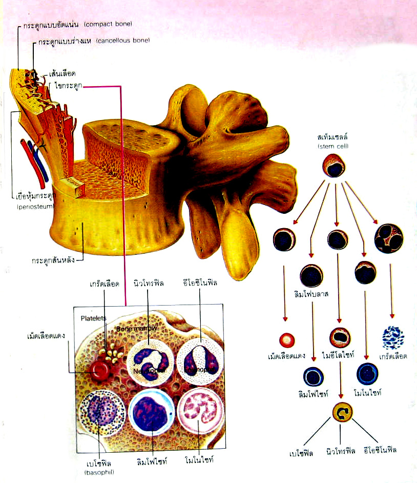 ⇒เม็ดเลือดขาว มีอยู่หลายชนิด ทั้งเม็ดเลือดแดง เม็ดเลือดขาว และเกล็ดเลือดพัฒนามาจากเซลล์ต้นตอชนิดเดียวกัน เรียกสเท็มเซลล์ (stem cell)