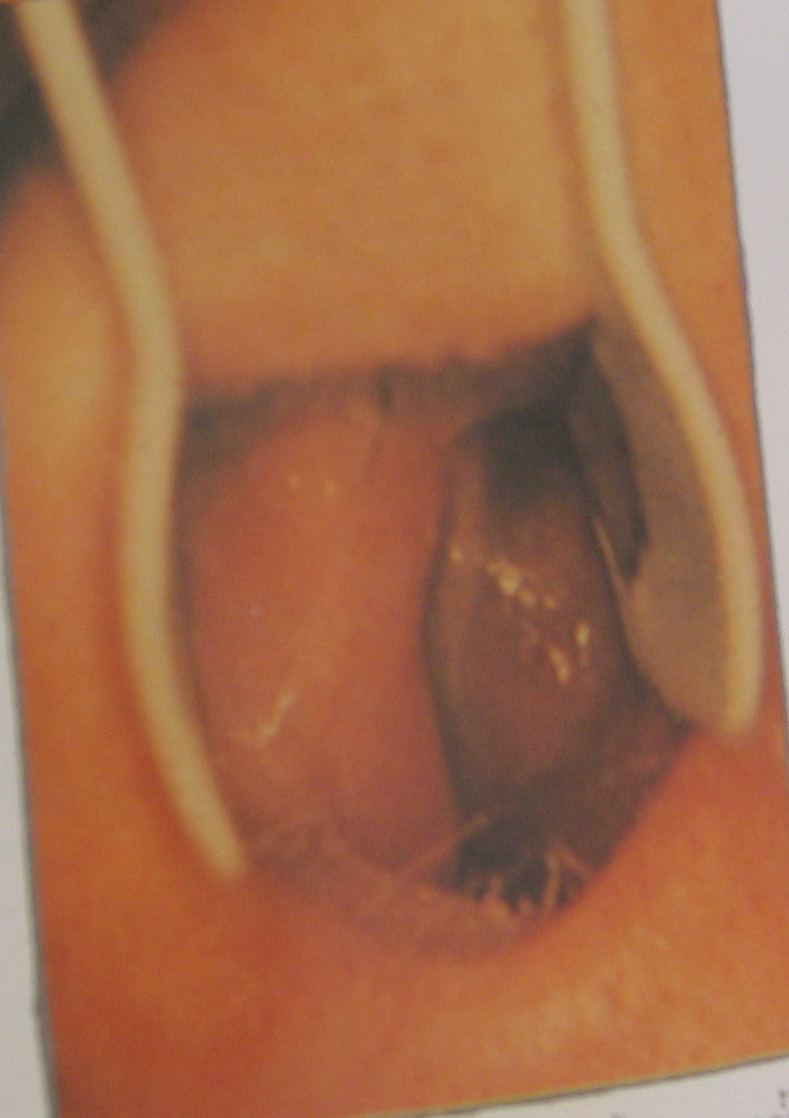 เมื่อใช้ไฟส่องดูรูจมูก จะพบก้อนเนื้อออกสีเทาๆ คล้ำๆ อุดตันรูจมูก ก้อนเนื้อนี้จะชิดผนังกลางจมูก (ในภาพจะปรากฏอยู่ทางด้านขวามือของผู้อ่าน)