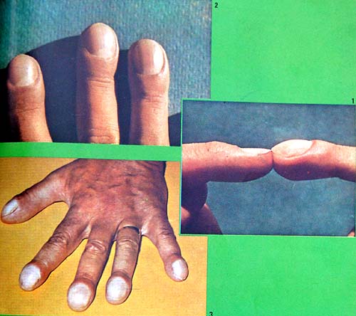 คุณผู้อ่านครับ ลองยกนิ้วมือขึ้น แล้วมองจากทางด้านข้าง (ดังในรูปที่ 1) ดูซิครับ จะเห็นว่า ตรงตีนเล็บ (ที่ติดกับเนื้อ) จะทำมุมเงยขึ้นจากเนื้อเล็กน้อย นี่คือเล็บที่เป็นปกติของคนเราทุกคน แต่คนที่มีอาการนิ้วปุ้ม เล็บจะมีลักษณะงุ้มลง ตรงตีนเล็บ แทนที่จะทำมุมเงยขึ้นเช่นคนปกติกลับลาดลงข้างล่าง (ดังรูปที่ 2) และถ้ามองทางด้านตรงจะเห็นปลายนิ้วมือมีลักษณะพองนูน (ดังรูปที่ 3) ฝรั่งเขาบอกว่ามีลักษณะเหมือนไม้ตะบอง จึงเรียกว่า “นิ้วตะบอง” (Clubbing finger)