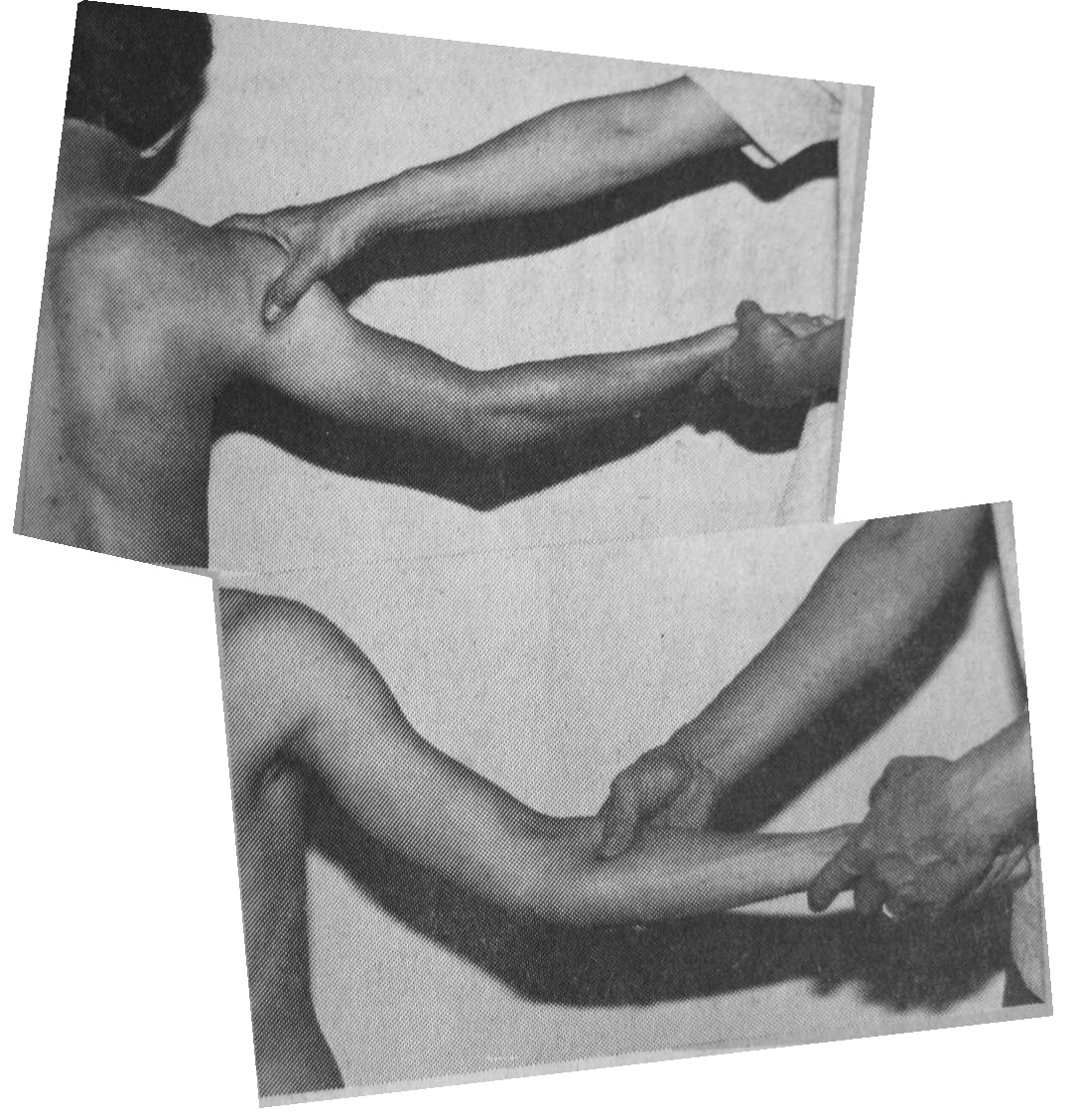 ต้นแขน ด้านหน้าและด้านหลังของต้นแขนเป็นกล้ามเนื้อมัดใหญ่ที่ทำหน้าที่งอข้อศอกและเหยียดข้อศอก โดยเฉพาะด้านข้างของต้นแขนจะมีเส้นประสาททอดผ่านจากต้นแขนด้านข้างที่ตรงกลางบริเวณของหัวไหล่ติดกับต้นแขน และที่เหนือบริเวณข้อศอกด้านใน (จุดไฟชอร์ต) จุดที่กล่าวมานั้นทั้ง 2 จุด ห้ามนวดเด็ดขาด เพราะจะทำให้เกิดการอักเสบและเส้นประสาทอาจพิการได้ หากจะนวดก็ไม่ควรกดลงที่จุดดังกล่าว ควรจะคลึงเบาๆ ไม่ควรคลึงด้วยความรุนแรง เพราะอาจจะทำให้เส้นประสาทนี้เสียไป กล้ามเนื้อเป็นอัมพาตกระดกข้อมือไม่ได้