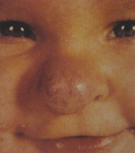 เด็กบางคนเกิดมาอาจมีหลอดเลือดที่เติบโตผิดปกติตรงบริเวณปลายจมูก ทำให้เห็นเป็นก้อนสีคล้ำๆ