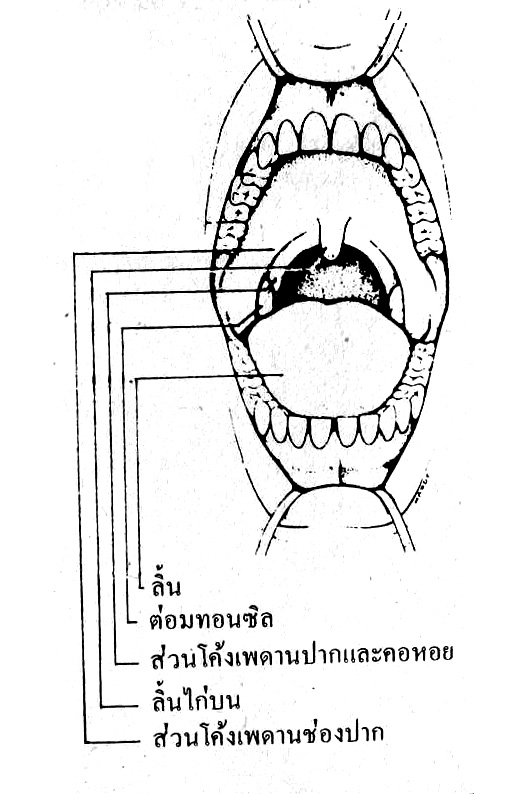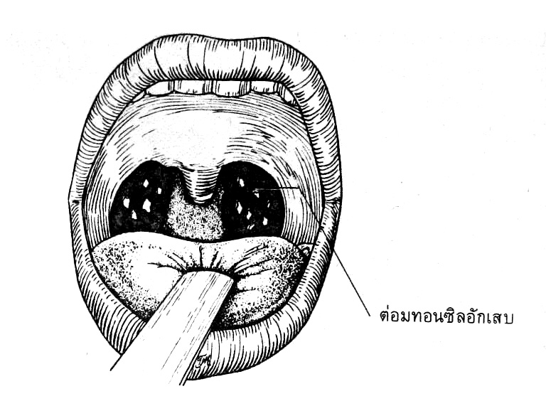 ให้อ้าปากและดูคอหอยของคนไข้ (สำหรับคนที่ต้องการตรวจตนเองก็อาจทำได้โดยอ้าปาก และดูคอหอยของตนเองในกระจกเงา) แล้วให้คนไข้ออกเสียง “อา” ดังๆ เพื่อให้โคนลิ้นแนบลงกับพื้นปาก และให้เพดานปากและลิ้นไก่กระดกขึ้นจะได้เห็นคอหอยได้ชัดเจนขึ้น (ดูวิธีการตรวจคอหอยในหมอชาวบ้านฉบับที่ 32)