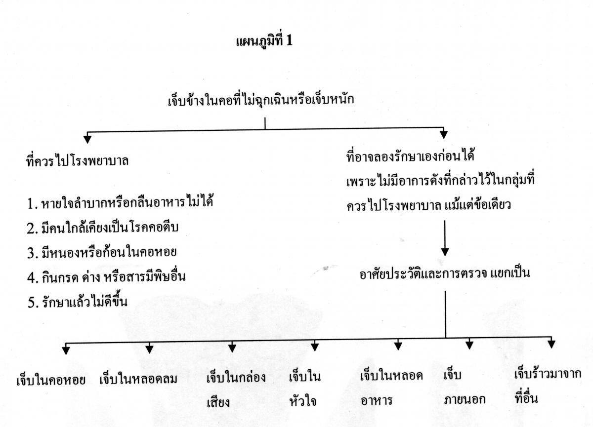 1.7 ถ้ามีอาการเจ็บหรือปวดในบริเวณอื่นด้วย เช่น เจ็บหน้าอกแล้วร้าวมาจุกที่คอ (ดูข้อ 1.4) หรือปวดศีรษะ ปวดหู แล้วร้าวมาปวดที่คอ หรืออื่นๆ มักจะแสดงว่าอาการเจ็บคอนั้นเป็นอาการเจ็บหรือปวดที่ร้าวมาจากที่อื่น ให้ดำเนินการรักษาที่ต้นตอของอาการเจ็บนั้น