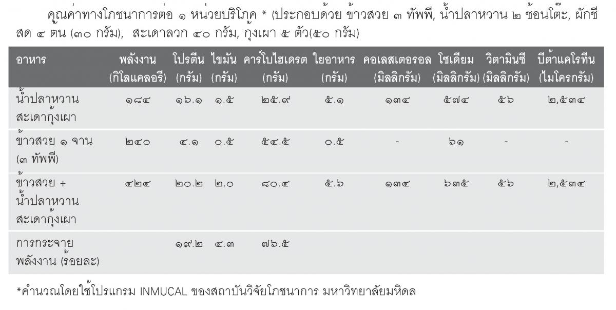 อย่างไรก็ตาม สำหรับผู้ที่ต้องการพลังงานวันละ 1,600 กิโลแคลอรี อาจกินกับข้าวได้อีกหนึ่งอย่าง เช่น อาหารประเภทแกงไม่ใส่กะทิ หรืออาจเป็นผลไม้ 1-2 ส่วน (ผลไม้ 1 ส่วน ได้แก่ ส้ม 1 ผลใหญ่ มะม่วง 1/2 ผล ฝรั่ง 1/3 ผลกลาง สับปะรด/มะละกอ 6-8 ชิ้นพอคำ เป็นต้น)