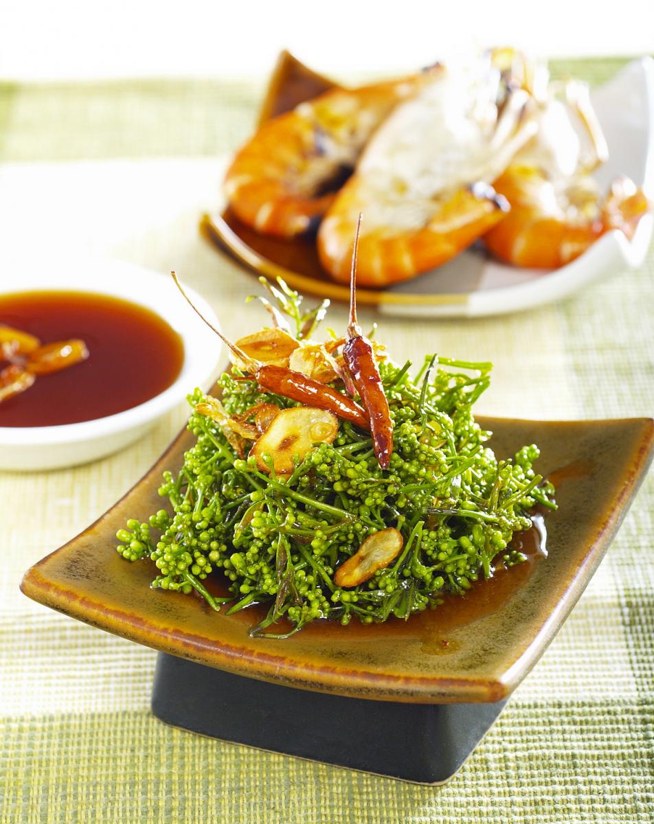 4. กุ้งทะเลเปลือกขาวตัวขนาดกลาง ล้างให้สะอาด นำไปย่างไฟ กินกับน้ำปลาหวาน สะเดา และผักชี
