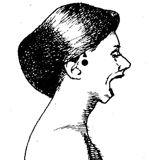 จะพบแอ่งเล็กๆ อยู่บนยอดของกระดูกขากรรไกร เมื่ออ้าปากจะคลำพบ แอ่งนี้อยู่ห่างจากใบหูประมาณ 2 นิ้วมือ
