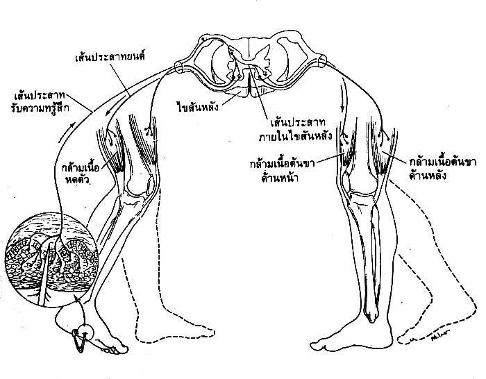 การกระทำดังกล่าวจะเกิดขึ้นช้ากว่าการยกขาในตอนแรกซึ่งกระทำไปโดยยังไม่ทันได้รู้ตัวเสียอีก เราจึงเรียกว่ารีแฟลกซ์ หรือการตอบสนองแบบฉับพลัน ส่วนการเคลื่อนไหวในระยะหลังเราเรียกว่า ถูกควบคุมภายใต้จิตใจ (สมอง) นั่นเอง
