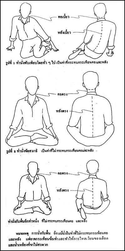 นอกจากนั่งบนเก้าอี้แล้ว ประเพณีของเรายังนิยมให้นั่งพับเพียบหรือนั่งขัดสมาธิ (รูปที่ 1 ) บนพื้น การนั่งพับเพียบนั้นเป็นท่าที่ไม่เหมาะมาก หลังจะต้องเบี้ยวไปข้างหนึ่งทำให้ต้องใช้มือช่วยพยุงไว้ และคอต้องเบี้ยวมาด้านตรงข้าม เพื่อพยายามให้ศีรษะตั้งตรงอยู่ตลอดเวลา จึงเกิดอาการปวดหลังและปวดคอได้ง่าย ทั้งยังทำให้ปวดในข้อตะโพกและข้อเข่า