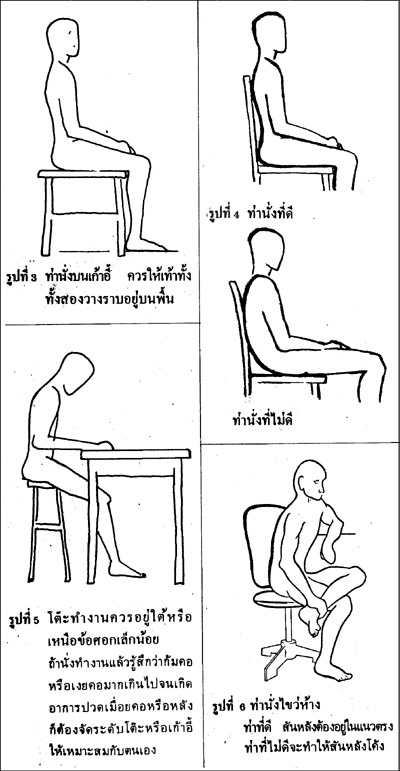 อย่างไรก็ดีเราควรจะนั่งบนเก้าอี้โดยให้เท้าทั้งสองวางราบอยู่บนพื้น (รูปที่ 3) เก้าอี้ที่สูงเกินไปหรือเตี้ยเกินไปทำให้เกิดอาการปวดหลังและเมื่อยขาได้
