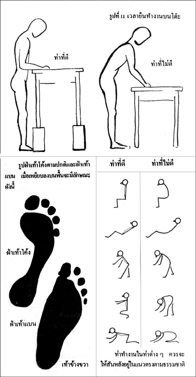 ท่ายืนที่ถูกต้องควรให้ศีรษะลำตัว และขาอยู่ในแนวเส้นตรง(รูปที่ 8 ) ไม่ควรใส่รองเท้าส้นสูง ตามปกติส้นรองเท้าสำหรับผู้ชายไม่ควรเกิน 1 นิ้วครึ่ง(รูปที่ 9) ส้นรองเท้าที่สูงเกินไปจะทำให้กล้ามเนื้อของขาต้องทำงานอย่างหนัก และเป็นสาเหตุหนึ่งของการปวดหลัง เนื่องจากกล้ามเนื้อหลังต้องทำงานหนักเพื่อไม่ให้ตัวล้มไปข้างหน้า