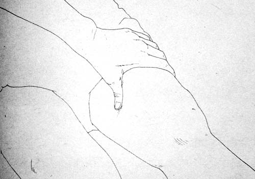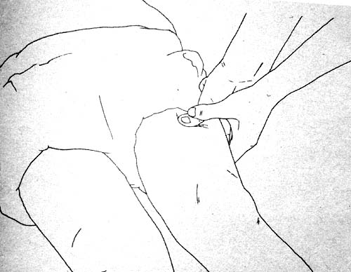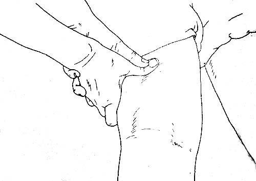 3. ใช้นิ้วหัวแม่มือกดกล้ามเนื้อต้นขาด้านใน (ในรูปแสดงการใช้นิ้วหัวแม่มือของมือข้างเดียว)