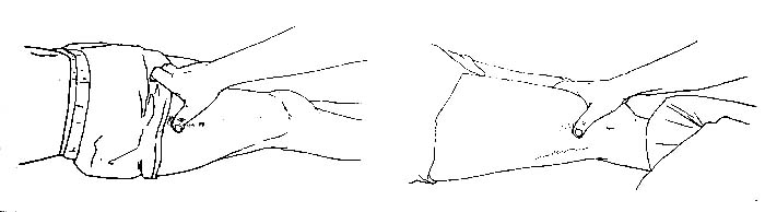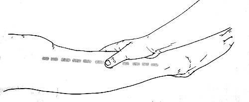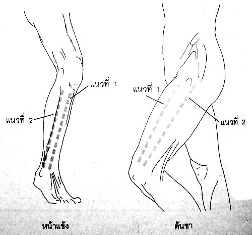 1. ใช้หัวแม่มือกดกล้ามเนื้อตั้งแต่ต้นขาด้านนอกไปตามแนวที่ 1 ไล่ลงไปถึงเหนือข้อเข่าด้านข้างแล้วย้อนกลับขึ้นตามแนวเดิม