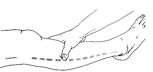 3. ใช้นิ้วหัวแม่มือกดกล้ามเนื้อชิดกระดูกหน้าแข้งด้านนอกแนวที่ 1 ไล่ลงไปถึงเหนือข้อเท้าแล้วย้อนกลับ