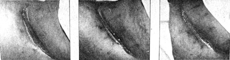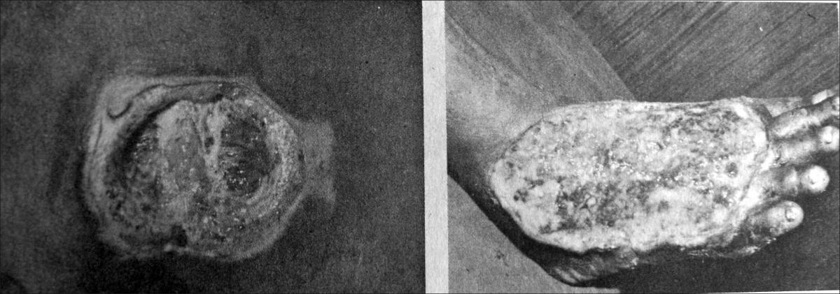 รูปแรกเป็นแผลที่ก้นกบ มักพบเสมอในผู้ที่เป็นอัมพาต แผลอย่างนี้รักษายากกว่าจะหาย บางทีเป็นแรมปี บางทีรักษาไม่หายเป็นไปจนตายก็มี ด้วยเหตุที่เรื้อรังหมอก็ระอา พยาบาลก็เอือมเพราะต้องเปลี่ยนแผลทุกวัน บางทีนอกจากจะไม่ดีขึ้นแล้วยังขยายตัวกว้างออกไปอีกด้วย