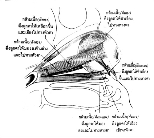 ตามีกล้ามเนื้อเล็ก ๆ 6 มัดขึงจากเบ้าตาไปติดกับลูกตา เพื่อให้ตากลอกไปทางซ้าย ขวา ขึ้น ลงได้