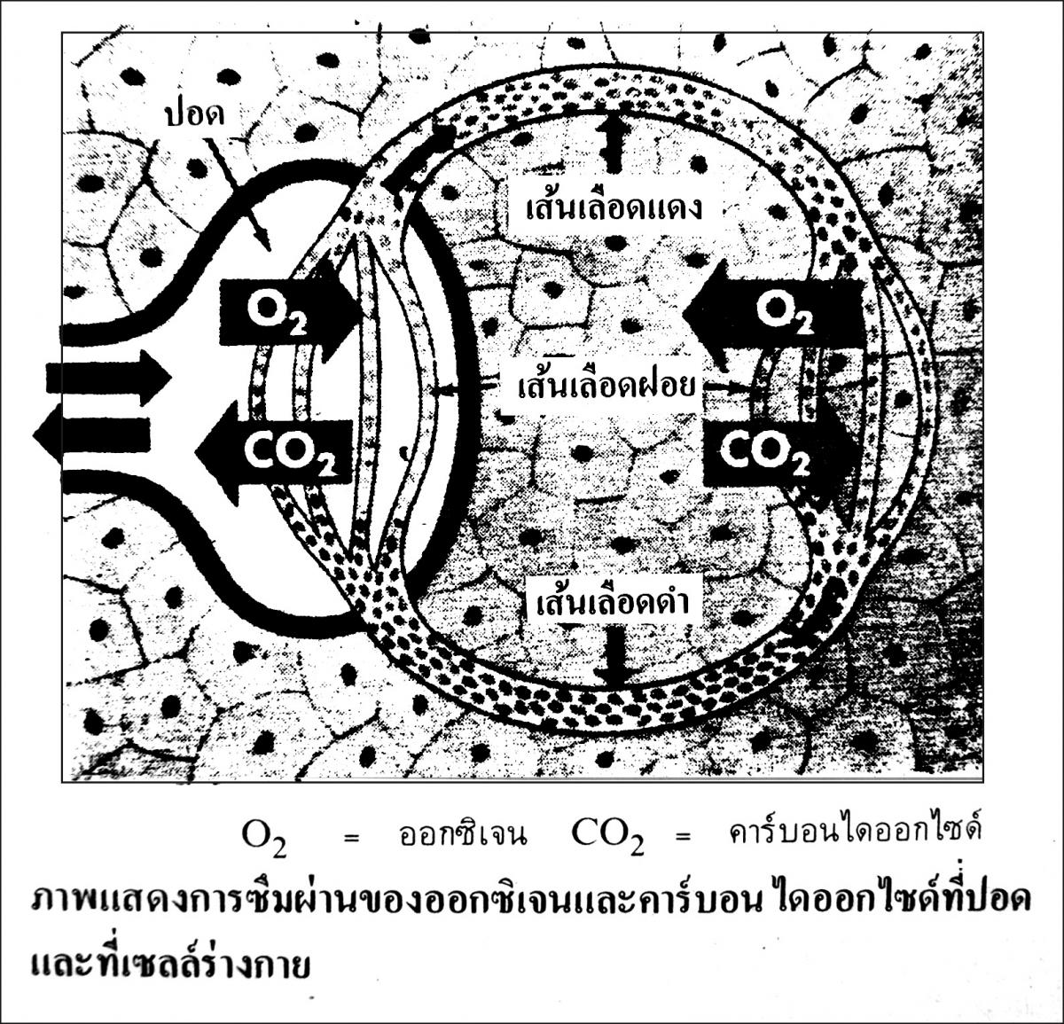 กระบวนการหายใจของคนเราไม่ได้จบลงแค่การสูดเอาอากาสเข้าปอดแล้วปล่อยออกมาเท่านั้น ในปอดออกซิเจนในอากาศจะซึมผ่านผนังเส้นเลือดฝอยในปอด เข้าสู่กระแสเลือด เม็ดเลือดจะจับออกซิเจนเอาไว้ไหลวนเวียนไปส่งให้เซลล์ร่างกายได้ใช้ในระดับเซลล์ของร่างกายออกซิเจน จะซึมออกจากผนังเส้นเลือดฝอยผ่านน้ำที่หล่อเลี้ยงเซลล์เข้าสู่เซลล์ร่างกายในที่สุด คาร์บอนไดออกไซด์ซึ่งเป็นของเสียจากเซลล์ก็จะซึมผ่านน้ำหล่อเลี้ยงเซลล์เข้าสู่เส้นเลือดฝอยส่วนที่เป็นเส้นเลือดดำ ในทำนองกลับกันกับที่ออกซิเจนเข้าสู่เซลล์ คาร์บอนไดออกไซด์ที่แขวนลอยอยู่ในน้ำเลือดก็จะเข้าสู่ปอดแล้วซึมผ่านผนังเซลล์ปอดปนออกไปกับอากาศที่เราหายใจออกไป จะเห็นได้ว่ากระบวนการหายใจก็คือการแลกเปลี่ยนออกซิเจนซึ่งเป็นก๊าซที่ร่างกายต้องการกับคาร์บอนไดออกไซด์อันเป็นของเสีย การหายใจจึงเกิดขึ้นได้ 2 ระดับคือที่ระดับเซลล์ปอดหรือในปอดกับที่ระดับเซลล์ของร่างกายดังที่ได้กล่าวมาแล้ว