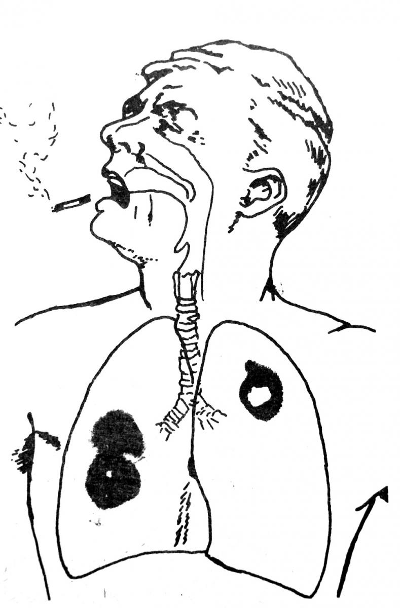 ควันบุหรี่ที่สูดเข้าไปกับลมหายใจก็จะผ่านหลอดลมใหญ่ หลอดลมเล็ก หลอดลมฝอยเข้าสู่ถุงลมปอดเช่นเดียวกับลมหายใจปกติ ควันสกปรกของบุหรี่ไม่ได้กลับออกมาพร้อมกับลมหายใจออกทั้งหมดหากแต่จะมีส่วนที่เกาะติดแน่นกับผนังหลอดลมและอุดอยู่ในถุงลมปอด เมื่อสูบบุหรี่ไปเป็นเวลานานทางเดินอากาศที่เป็นทางเข้าออกของลมหายใจก็จะสกปรก เช่นเดียวกันกับหิ้งหรือชั้นหรือบริเวณเหนือเตาไฟที่เต็มไปด้วยเขม่าควัน ในห้องครัวเรายังมีทางทำความสะอาดได้ แต่ในปอดความสกปรกที่เกาะติดอยู่เป็นเรื่องที่แก้ไขไม่ได้ เมื่อทางเดินอากาศตีบตัน การเข้าออกของลมหายใจก็ลำบาก โดยเฉพาะลมหายใจออก ทำให้มีลมหายใจคั่งค้างอยู่ในปอดเกิดภาวะปอดพองลม การหายใจหรือการแลกเปลี่ยนก๊าซออกซิเจนกับคาร์บอนไดออกไซด์ก็จะถูกกระทบกระเทือน เมื่อร่างกายมีออกซิเจนใช้น้อยลงก็จะเหนื่อยง่ายไม่มีแรง อีกประการหนึ่งการที่เขม่าควันบุหรี่จับเกาะอยู่ในหลอดลมก่อให้เกิดการระคายเคืองแก่เนื้อเยื่อที่เราเรียกว่าการอักเสบ นอกจากนี้นิโคตินยังเป็นสาเหตุของมะเร็งปอดอีกด้วย คนที่สูบบุหรี่นาน ๆจะเกิดอาการหลอดลมอักเสบเรื้อรัง โรคถุงลมโป่งพองและเป็นมะเร็งปอดได้