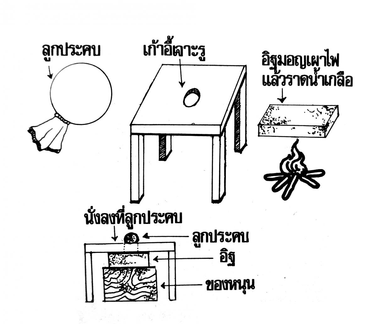 ขั้นที่สอง เอาเก้าอี้ตัวเตี้ย ๆ เจาะรูตรงกลางพอให้ลูกประคบลอดได้