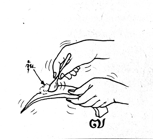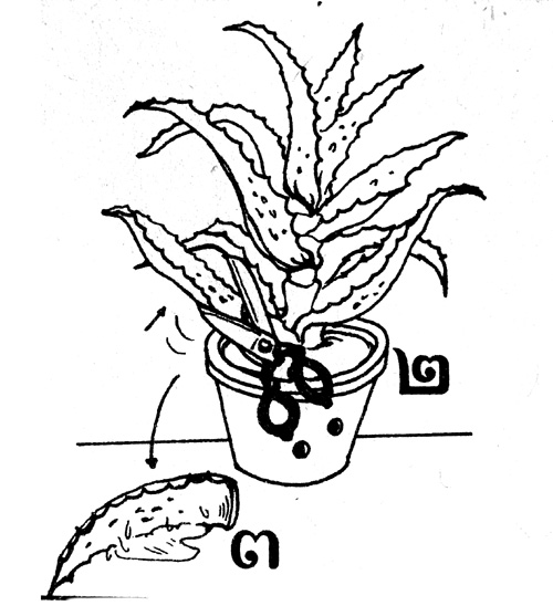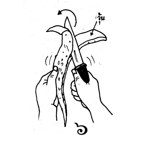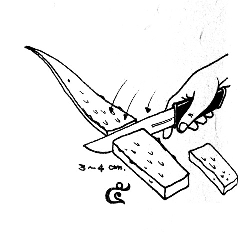 “ขั้นแรก ต้องเลือกใบที่ไม่แก่ หรืออ่อนเกินไป ตัดเป็นลักษณะปากฉลาม (รูปที่ 2) และนำมาวางตะแคง เพื่อให้ยางสีเหลืองไหลออกให้หมด ทิ้งไว้ประมาณ 8-10 นาที (รูปที่ 3)
