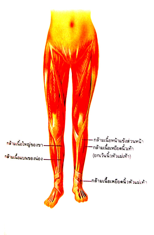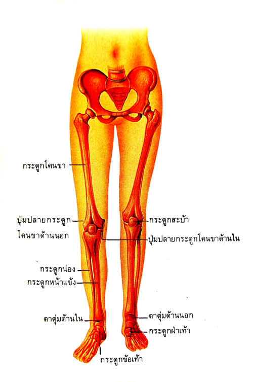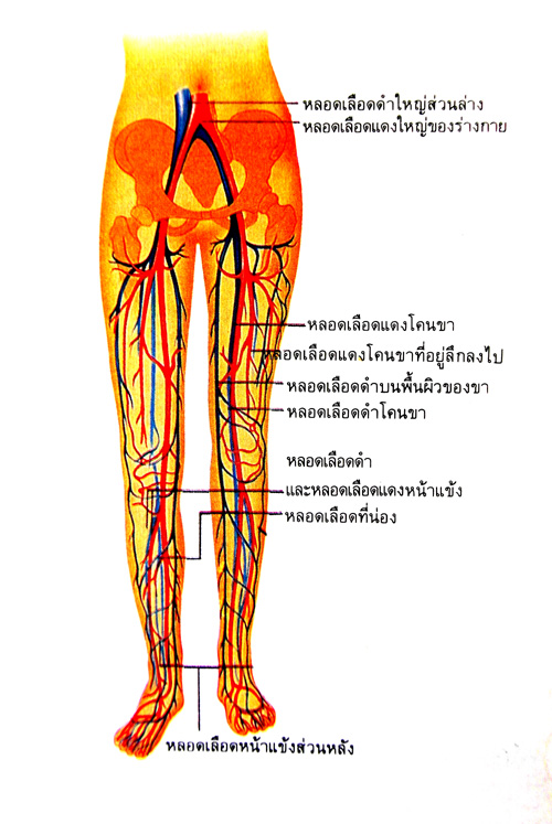 กระดูกขา (บนซ้าย) เป็นส่วนที่ยาวที่สุด และหนักที่สุดในร่างกาย กล้ามเนื้อ (ล่างซ้าย) เป็นส่วนที่เต็มไปด้วยพละกำลังที่ทำให้เราสามารถยืนหรือวิ่งได้ ทั้งกระดูกและกล้ามเนื้อถูกหล่อเลี้ยงด้วยหลอดเลือดแดงและหลอดเลือดดำ (ล่างขวา)