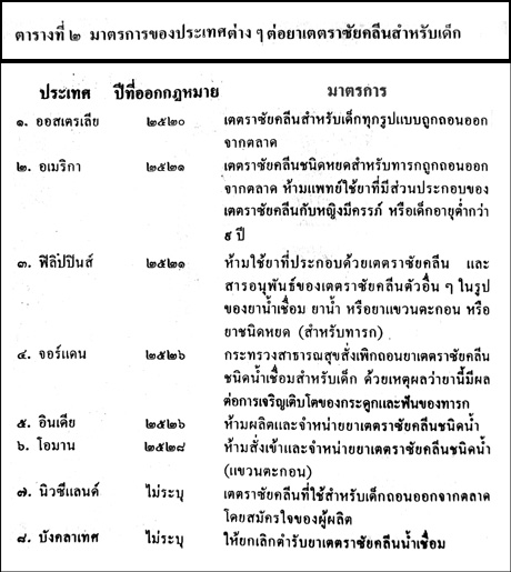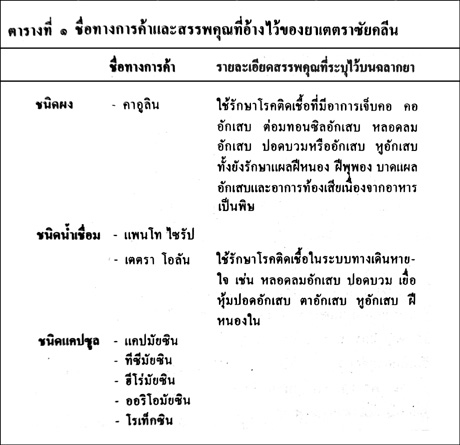 เตตราซัยคลีนเป็นยาปฏิชีวนะที่แพทย์ใช้สำหรับรักษาโรคติดเชื้อบางชนิดในผู้ใหญ่เท่านั้น และจัด เป็นยาอันตราย แต่ในบ้านเรามีความนิยมใช้กันในหมู่ประชาชนกันเองอย่างกว้างขวาง โดยมีการใช้กันอย่างผิด ๆ โดยเฉพาะอย่างยิ่งใช้เป็นยาลดไข้ในเด็ก ยานี้มีการผลิตเพื่อใช้เป็นยาสำหรับเด็กในรูปแบบต่าง ๆ เช่น ยาผงบรรจุซอง ยาน้ำเชื่อม ยาเม็ด และยาแคปซูล (ตารางที่ 1) ยาประเภทนี้เป็นที่นิยมใช้กันมาก ทั้งนี้เพราะแรงโฆษณา โดยเฉพาะอย่างยิ่งทางวิทยุเอเอ็ม, ประกอบกับการหาซื้อได้ง่าย เพราะมีวางขายอยู่โดยทั่วไป แม้ กระทั่งแผงขายของอยู่ในหมู่บ้าน