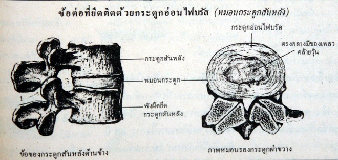 ข้อต่อที่ยึดด้วยกระดูกอ่อนไฟบรัส ได้แก่ ข้อต่อของกระดูกสันหลังที่เชื่อมด้วยหมอนกระดูกนั่นเอง ข้อชนิดนี้ไม่มีเยื่อบุข้อ จึงไม่มีน้ำไขข้อ แต่ประกอบด้วยกระดูกอ่อน ซึ่งล้อมรอบส่วนตรงกลางที่มีลักษณะคล้ายวุ้น มีพังผืดยึดติดกระดูกอ่อนโดยรอบและเชื่อมโยงติดกับกระดูกสันหลัง (ดูรูปประกอบที่ 2)