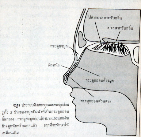 จมูกของเรามีไว้หายใจและดมกลิ่น หน้าที่ในการดมกลิ่นของจมูกดูเหมือนในมนุษย์ จะไม่มีความสำคัญมากมายนักหากเทียบกับสัตว์ สำหรับสัตว์การดมมีความจำเป็นและสำคัญต่อชีวิตของมันมากทีเดียว เพราะกลิ่นที่มันดมได้จะบอกถึงที่มาของอาหาร บอกถึงศัตรูที่มากล้ำกราย และบอกถึงกลิ่นคู่ของมัน สำหรับการดมกลิ่นของคนเรา เป็นไปเพื่อความรื่นรมย์เสียมากกว่า แต่อย่ามาบอกว่ากลิ่นนั้นไม่มีความสำคัญ หรือจมูกไม่ต้องรับรู้กลิ่นก็ได้นะ ไม่มีใครยอมที่จะไม่รับรู้กลิ่นหรอก เพราะนั้นจะหมายความว่าชีวิตเขาขาดความสุนทรีย์ไปทีเดียวอย่างเช่น มองดอกมะลิก็เห็นแต่ดอกเล็กๆ ขาวๆ ไม่ได้กลิ่นมะลิ ไปชายทะเลก็ไม่ได้กลิ่นสดชื่นของทะเล กินข้าก็ไม่อร่อยเพราะไม่ได้กลิ่นหอมของกับข้าว