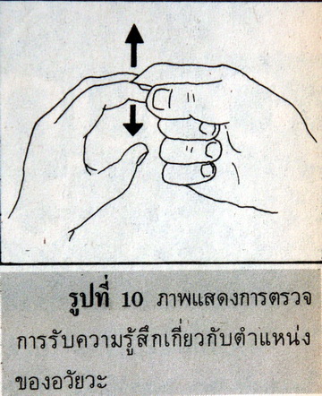 การตรวจในเรื่องนี้ ส่วนใหญ่จะตรวจที่นิ้วมือและนิ้วเท้า โดยให้คนไข้หลับตาแล้วผู้ตรวจจับนิ้วหนึ่งนิ้วใดของคนไข้เงยขึ้น งอลงสลับกัน ไปมาสักพัก 2-3 ครั้ง แล้วจับนิ้วไว้ให้อยู่ในท่าหนึ่งท่าใด (จะเงยขึ้น งอลง หรืออยู่ในท่าปกติ) แล้วถามคนไข้ว่านิ้วอยู่ในท่าใด ถ้าคนไข้ตอบถูก แสดงว่านิ้วมือหรือนิ้วเท้านั้นยังรับความรู้สึกเกี่ยวกับตำแหน่งของมันเป็นปกติ (ดูรูปที่ 10)