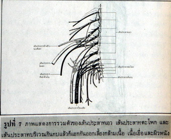 เส้นประสาทเหล่านี้จะรวมตัวกันแล้วก็แยกออกเลี้ยงกล้ามเนื้อ เนื้อเยื่อ และผิวหนังในบริเวณเอง ตะโพก ฝีเย็บ ขาและเท้า (ดูรูปที่ 7) เช่น