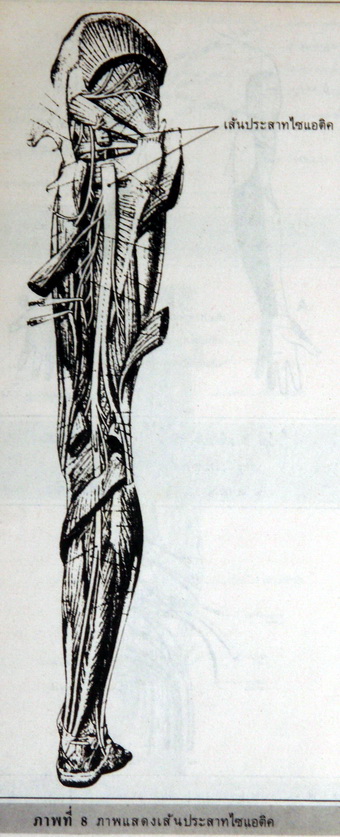 เส้นประสาทเอวเส้นที่ 4, 5 และเส้นประสาทตะโพกเส้นที่ 1-3 และบางส่วนของเส้นที่ 4 จะรวมตัวกันเป็นเส้นประสาทใหญ่ เรียกว่า เส้นประสาทไซแอติค ซึ่งเลี้ยงบริเวณตะโพกด้านหลังของต้นขาและเท้า (ดูรูปที่ 8)