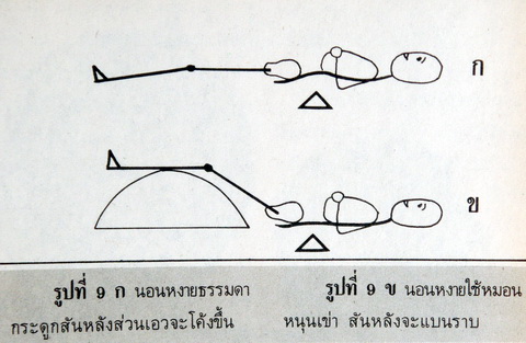 การรักษาจึงต้องมุ่งไปที่สันหลังไม่ใช่รักษาที่ขาหรือเท้าที่ชาหรือปวด พยายามนอน นั่ง ยืน เดิน ให้สันหลังตรง และในขณะที่ปวดมาก ควรจะนอนหงายบนพื้นที่ราบเรียบ (พื้นที่นุ่มไม่ราบเรียบ เช่นที่นอนนุ่มๆ จะทำให้สันหลัง และปวดมากขึ้น) และให้หมอนหนุนเข่าทั้ง 2 ขึ้น กระดูกสันหลังจะได้แบนราบเป็นเส้นตรง ทำให้บรรเทาอาการปวดลงได้ (ดูรูปที่ 9)
