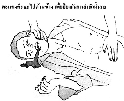 1. ให้ผู้ป่วยนอนคว่ำ หรือนอนหงายและตะแครงศีรษะไปด้านหนึ่ง เพื่อป้องกันการสำลักน้ำลาย หรืออาหารที่อาเจียนออกมาเข้าไปในหลอดลม และถ้าสามารถล้วงฟันปลอมหรือสิ่งอื่นในปาก ที่อาจหลุดและสำลักไปอุดกั้นหลอดลมได้ ก็ต้องทำด้วย