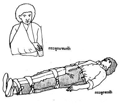 10. ถ้ามีบาดแผล ให้ล้างด้วยน้ำสะอาด แล้วราดด้วยเหล้าแรง ๆ หรือทิงเจอร์ไอโอดีน ถ้ามีรอยฟกช้ำที่สงสัยว่ากระดูกจะหัก ให้มัดส่วนนั้นไว้ไม่ให้เคลื่อนไหว (ดูรูป)แล้วรีบพาคนไข้ไปหาหมอ ถ้ามีขวดยา ถุงยา สลากยา หรือยาพิษอะไรที่สงสัยว่าผู้ป่วยจะกิน หรือถูกต้อง ให้นำติดตัวไปด้วย