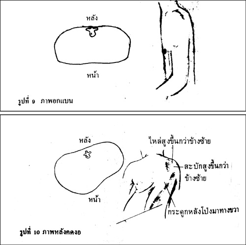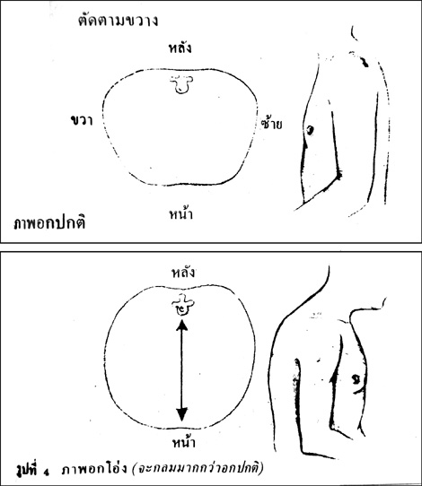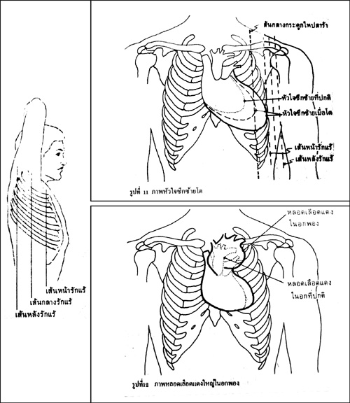 1.8 อกแบนหรือโป่งข้างเดียว (unilateral flattening or prominence) อกแบนแฟบข้างเดียว มักเกิดจากหลังคด (scoliosis) หรือเกิดจากโรคปอดเรื้อรังที่ทำลายเนื้อปอดข้างเดียวไปมาก เช่น วัณโรค (ดูรูปที่ 10)