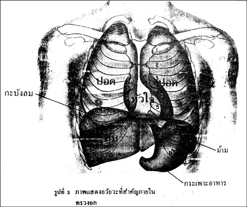 ภายในทรวงอก จะเป็นที่อยู่ของอวัยวะที่สำคัญๆ คือ ปอดและหลอดลม หัวใจและหลอดเลือดใหญ่ในอก หลอดอาหาร และใต้กะบังลมซึ่งปิดช่องอกทางด้านล่างก็จะมีตับอยู่ใต้ชายโครงขวา มีกระเพาะอาหารและม้ามอยู่ใต้ชายโครงซ้าย (ดูรูปที่ 3)